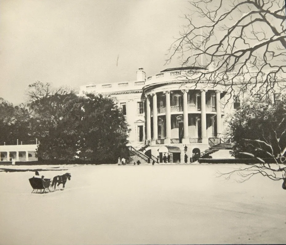 The 1962 card featured an evocative photograph taken on February 13, 1962, by White House photographer Cecil Stoughton, showing the Kennedy children in a sleigh pulled by the pony "Macaroni" on the lawn in front of the White House.