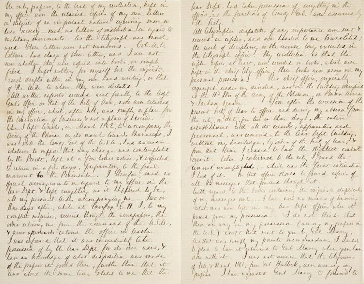 In response to a Grant inquiry, McClellan gives a detailed response to Grant in this letter. In it, he defends his practices and also airs some of his personal grievances, including that he found out of his dismissal by President Lincoln via a newspaper.